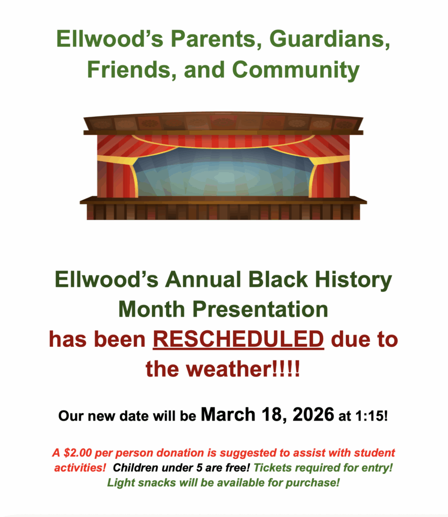 Hello Ellwood Parents and Guardians. Tomorrow, December 15th, will be a 2 – Hour Delay Schedule due to the weather. School will start at 10:15 and Breakfast will be served at 10:00. We look forward to seeing all scholars in the morning!