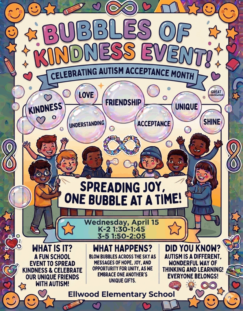 Ellwood Scholars will be blowing bubbles, spreading joy one bubble at a time, celebrating Autism Acceptance Month.