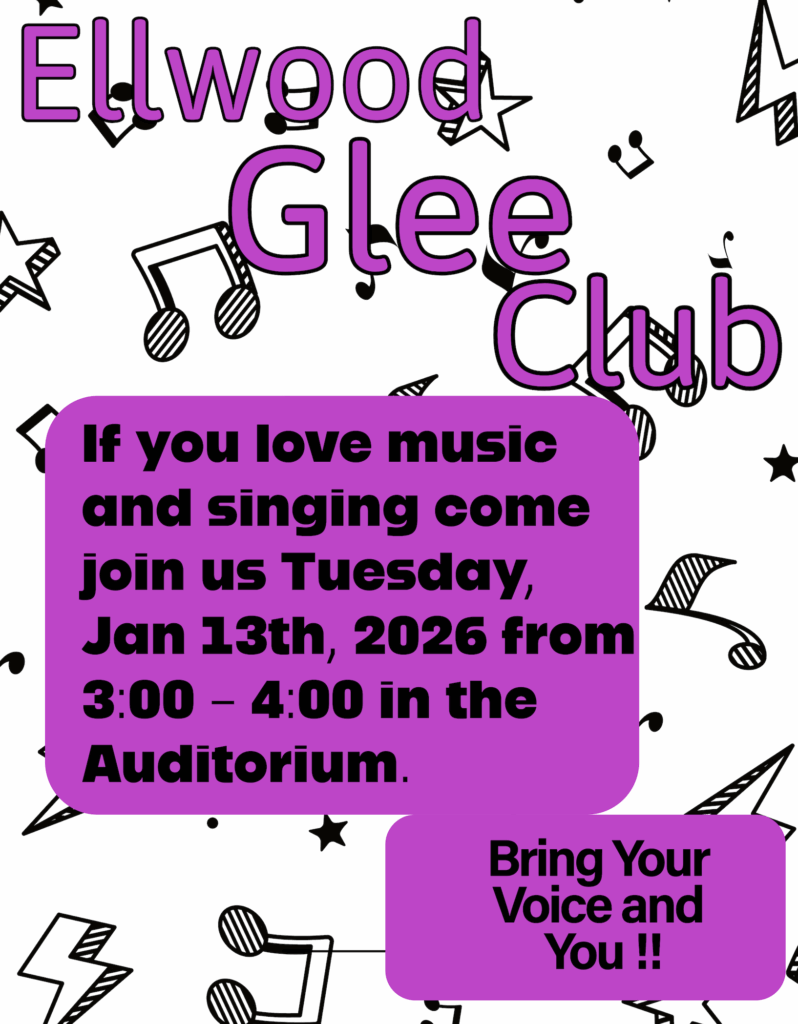 Ellwood Glee Club is being formed. If you love music and singing, please join us on Tuesday, January 13th from 3:00- 4:00 allowing us to get a gauge of how many scholars would be interested in the club.